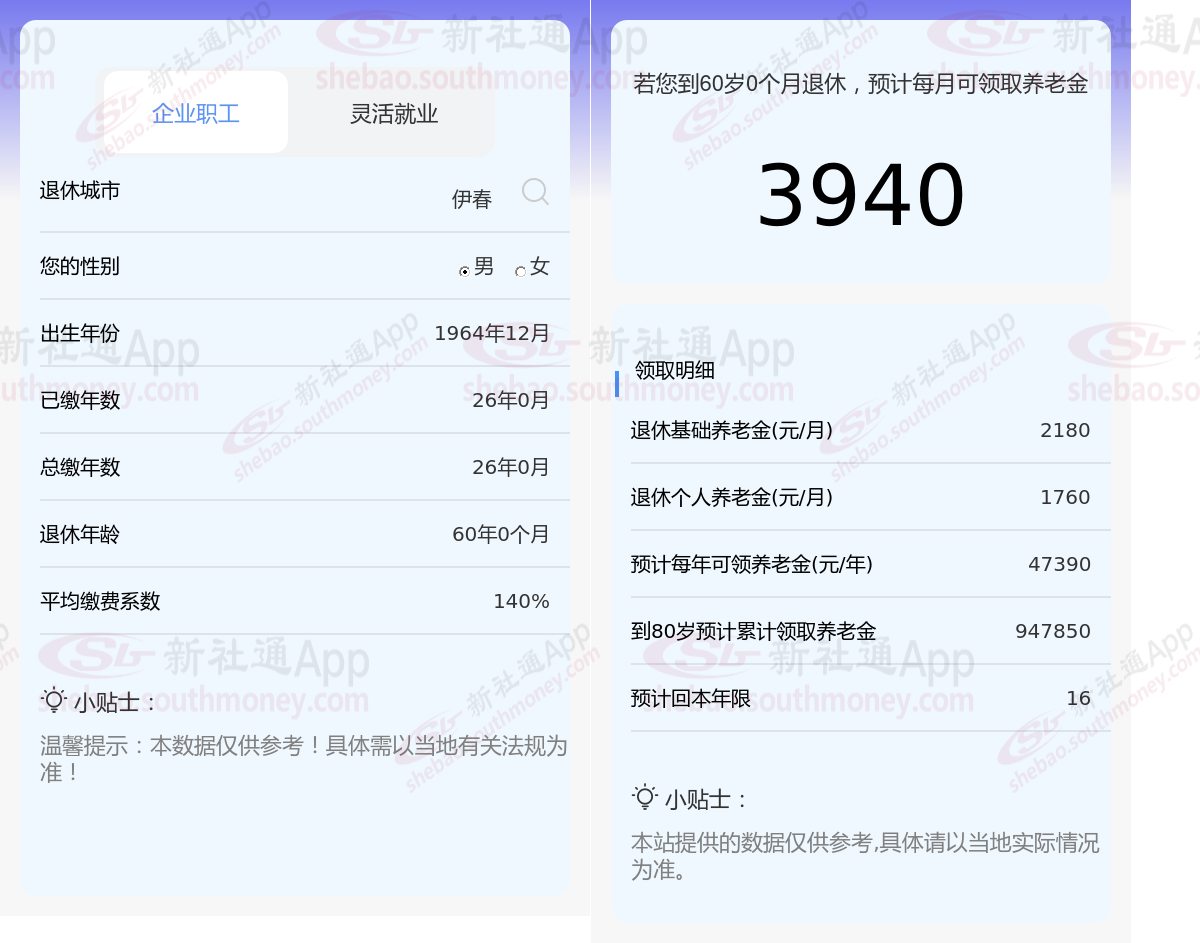 希某,作为一位勤勉的职工,他的养老保险缴纳记录长达26年之久,且缴费档次一直保持在较高的140%水平。基于这些关键数据,我们利用新社通app养老金计算器,结合最新的养老保险法规,对其养老金进行了如下估算: