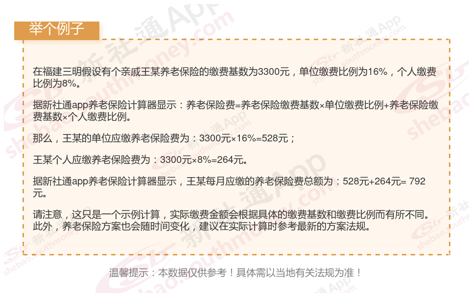 据新社通app显示,福建三明职工养老保险最低缴费基数为:3300元;单位和个人的缴费比例分别为:16%、8%;