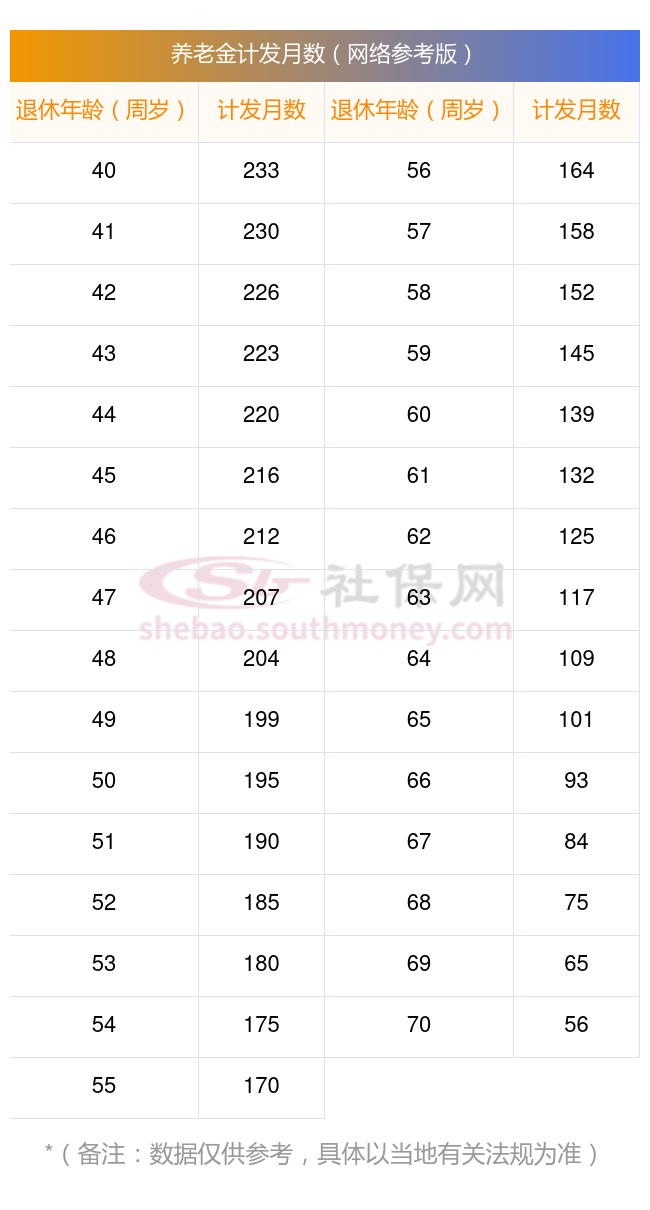 在我国,不同的退休年龄对应着不同的养老金计发月数。目前,60岁、55岁和50岁退休职工的个人账户养老金的计发月数分别为139个月、170个月和195个月。养老金计发月数指的是养老金待遇计划发放的月数。这些计发月数是根据城镇人口平均估计寿命、退休年龄、基金投资收益率等因素得出的。
