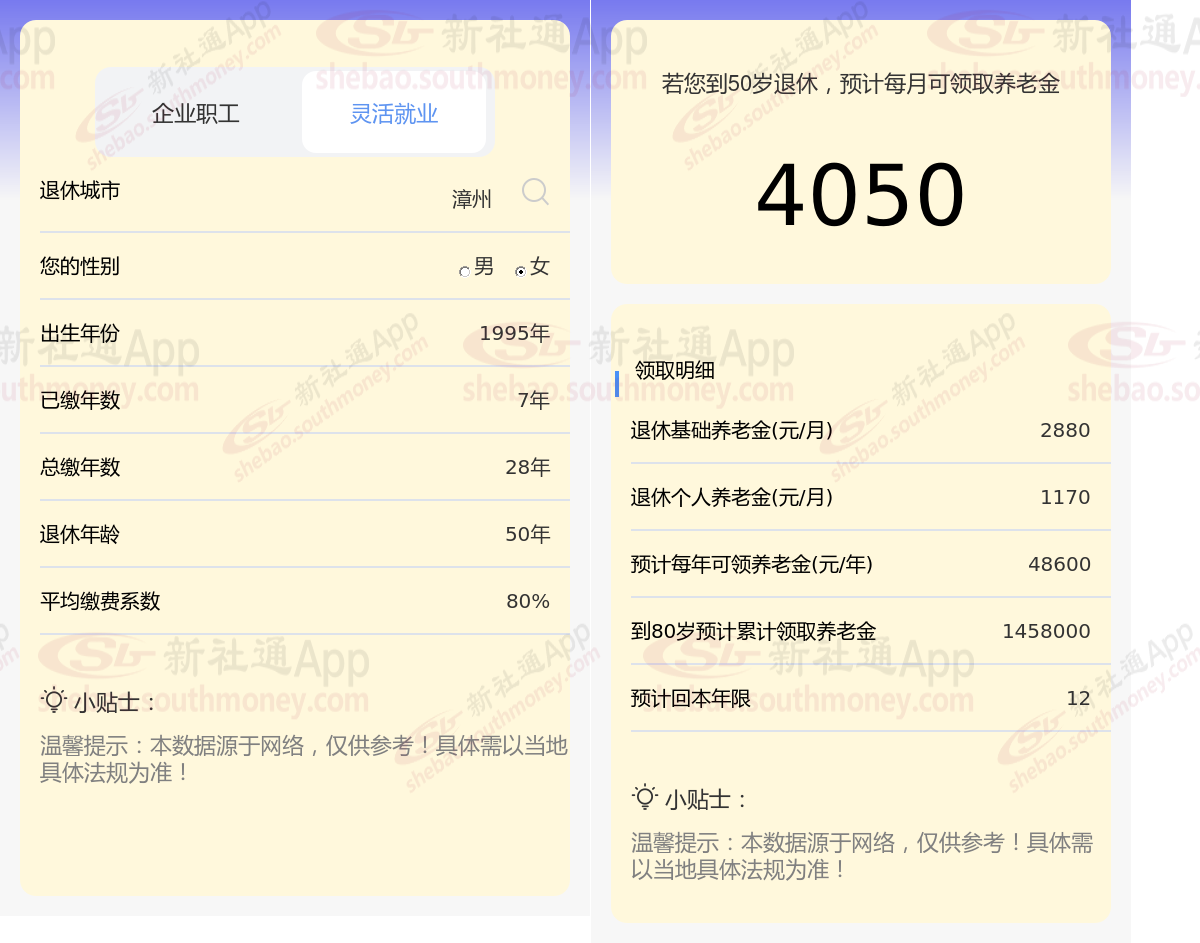 通过新社通APP-养老金计算所得:假设都在漳州退休、出生年份、退休年龄和缴费系数均保持不变的情况下,若个人的社保缴费年限累计达到30年,那么其相关计算方式如下: