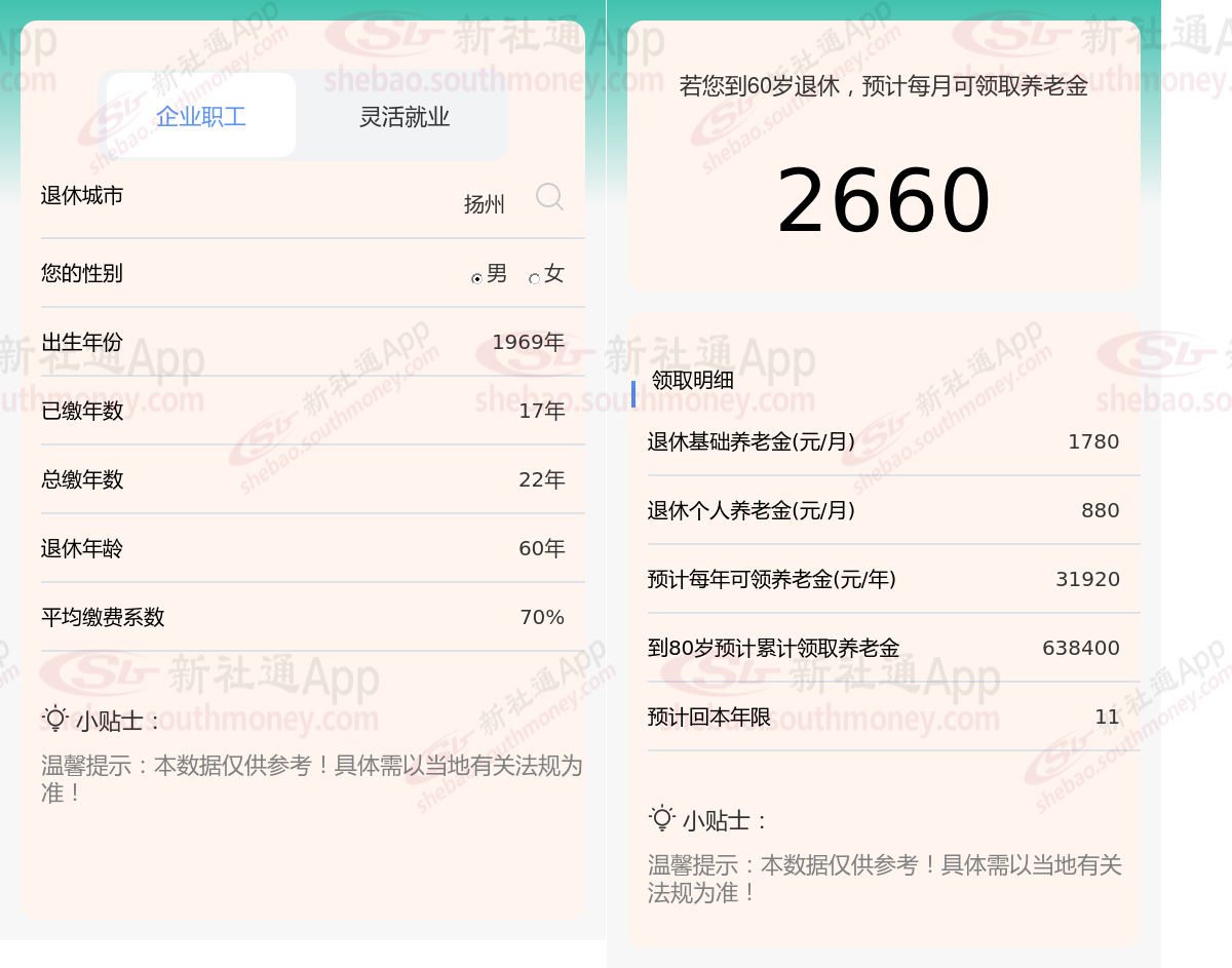 通过新社通APP-养老金计算所得:假设都在扬州退休、出生年份、退休年龄和缴费系数均保持不变的情况下,若个人的社保缴费年限累计达到22年,那么其相关计算方式如下: