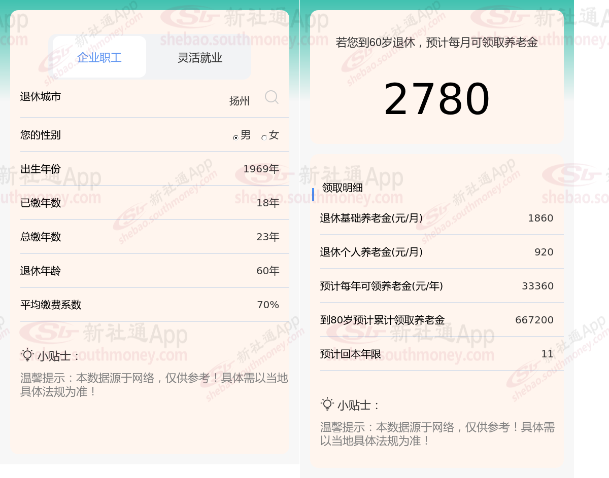 通过新社通APP-养老金计算所得:假设都在扬州退休、出生年份、退休年龄和缴费系数均保持不变的情况下,若个人的社保缴费年限累计达到23年,那么其相关计算方式如下: