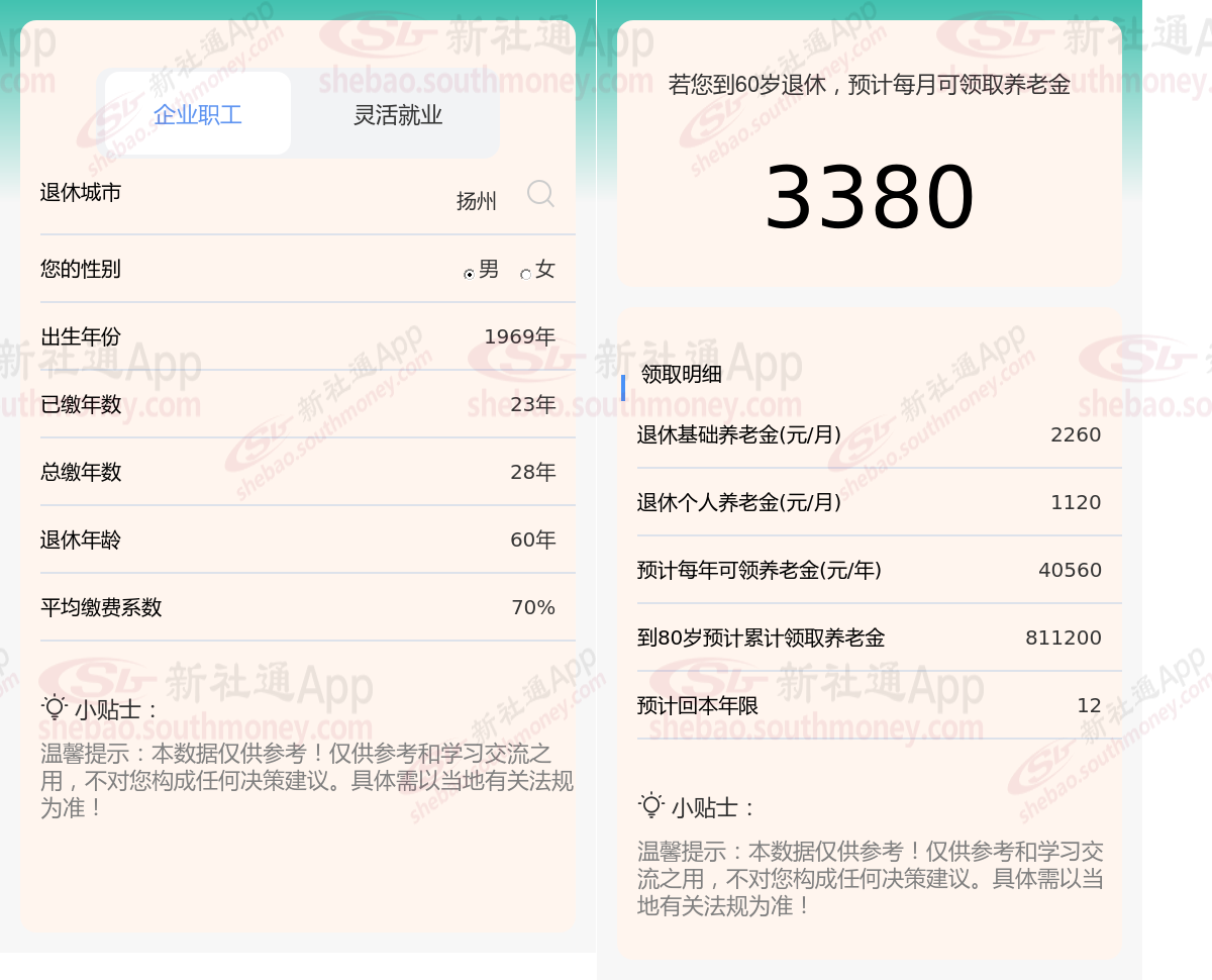 通过新社通APP-养老金计算所得:假设都在扬州退休、出生年份、退休年龄和缴费系数均保持不变的情况下,若个人的社保缴费年限累计达到28年,那么其相关计算方式如下: