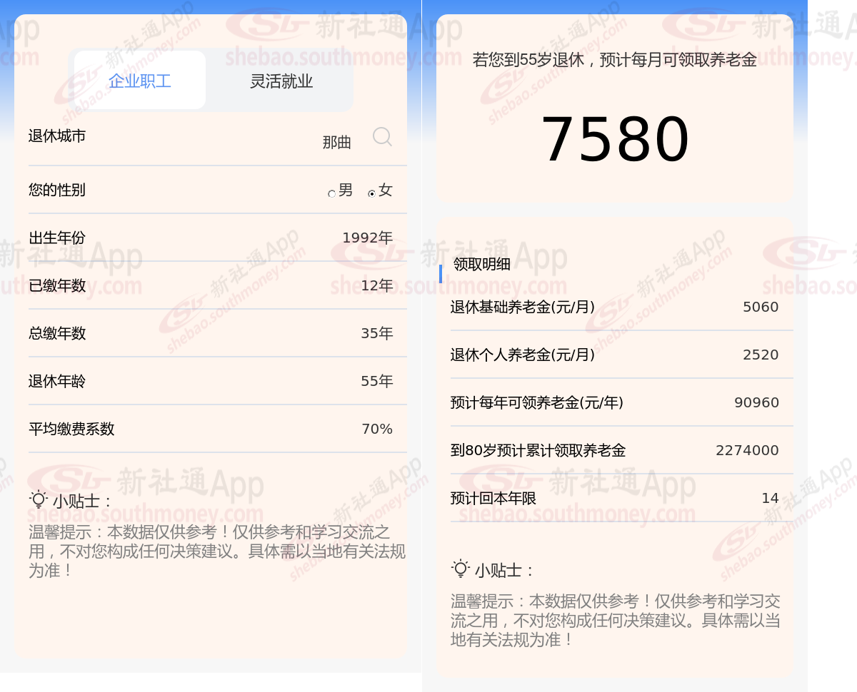 通过新社通APP-养老金计算所得:在保持退休城市、出生年份、退休年龄以及缴费系数这些条件不变的前提下,当个人的社保缴费年限累积达到35年时,其相关计算方式如下: