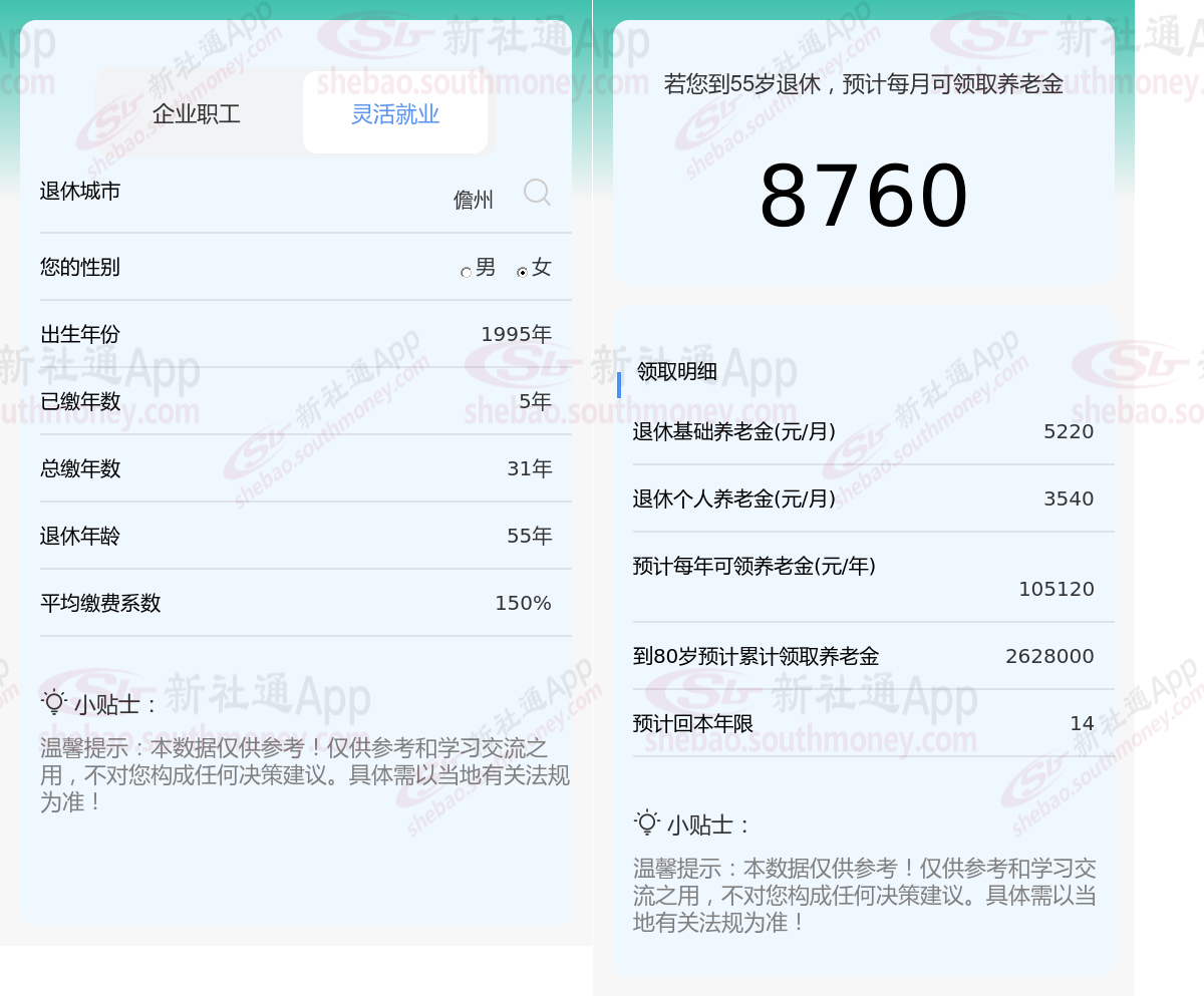通过新社通APP-养老金计算所得:在保持退休城市、出生年份、退休年龄以及缴费系数这些条件不变的前提下,当个人的社保缴费年限累积达到31年时,其相关计算方式如下: