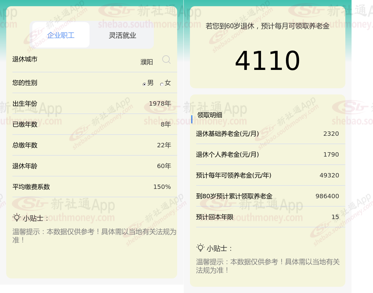 通过新社通APP-养老金计算所得:退休城市、出生年份、退休年龄、缴费系数都相同的情况下,社保缴费年限累计22年时,计算如下: