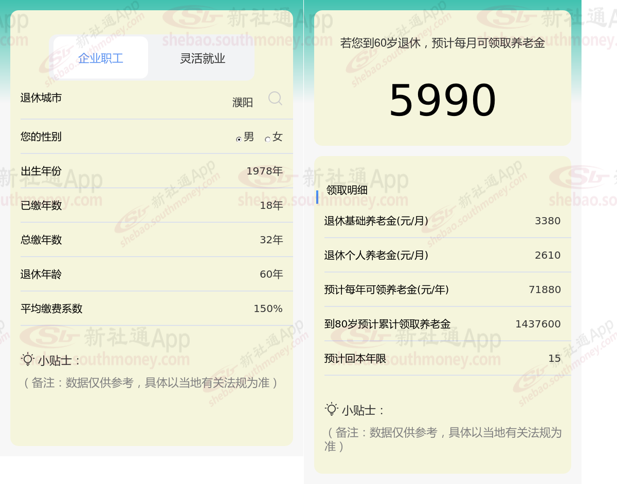 通过新社通APP-养老金计算所得:退休城市、出生年份、退休年龄、缴费系数都相同的情况下,社保缴费年限累计32年时,计算如下:
