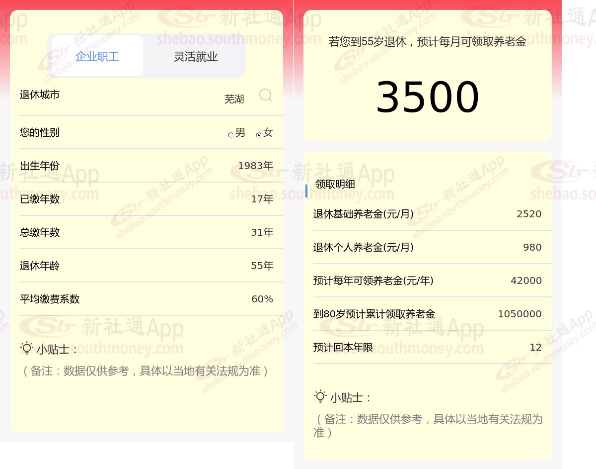 通过新社通APP-养老金计算所得:在保持退休城市、出生年份、退休年龄以及缴费系数这些条件不变的前提下,当个人的社保缴费年限累积达到31年时,其相关计算方式如下: