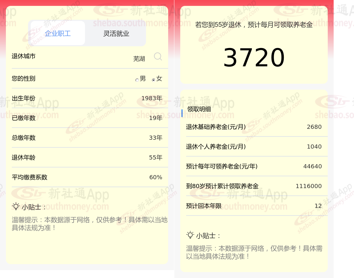 通过新社通APP-养老金计算所得:在保持退休城市、出生年份、退休年龄以及缴费系数这些条件不变的前提下,当个人的社保缴费年限累积达到33年时,其相关计算方式如下: