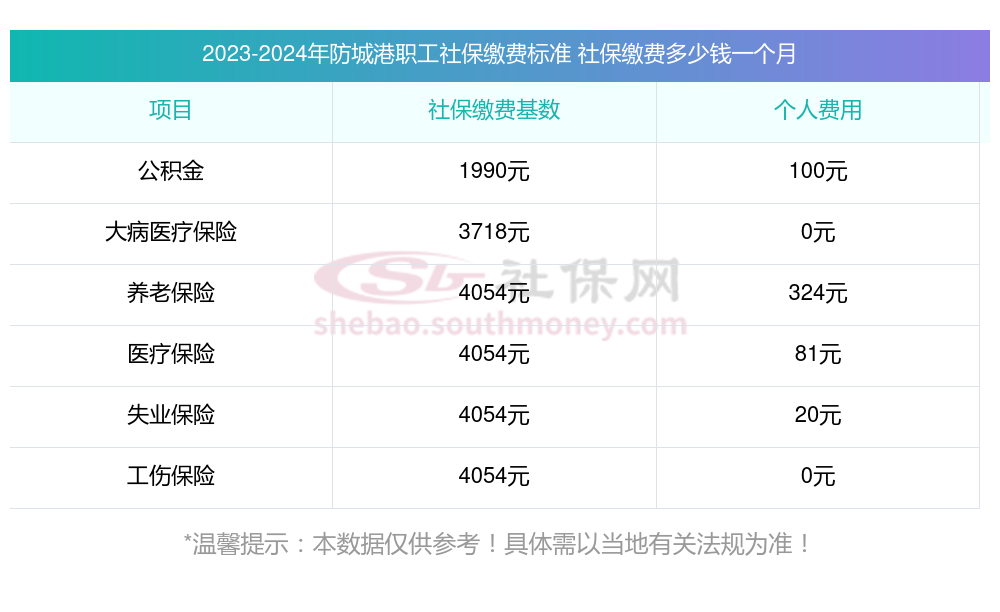 2024年防城港社保缴费多少钱?下表是2023-2024年防城港社保费用明细参考,新社通app-社保缴费查询工具提供的最新数据如下: