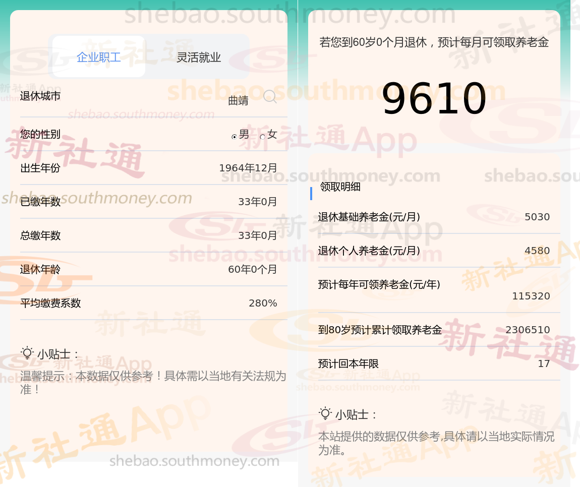 退休城市:曲靖,性别:男,出生年份:1964,总缴年数33年,缴费档次:280%,新社通app养老金计算器所得: