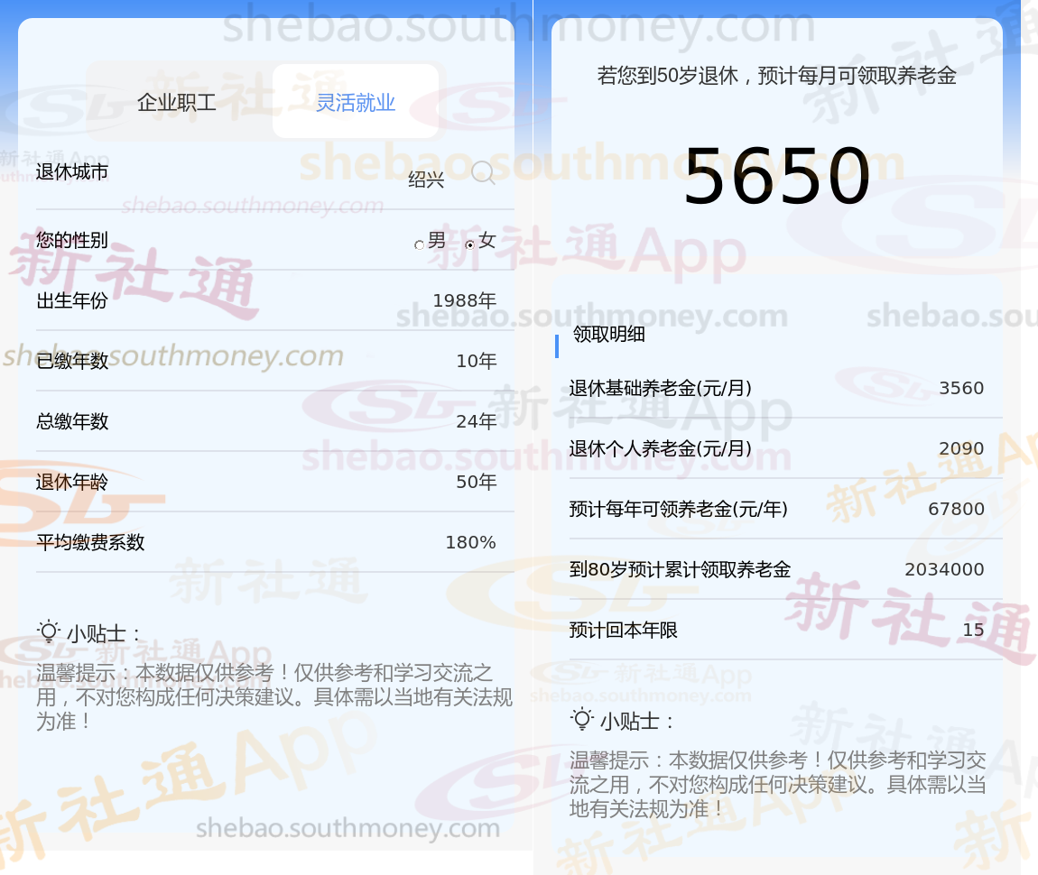 通过新社通APP-养老金计算所得:退休城市、出生年份、退休年龄、缴费系数都相同的情况下,社保缴费年限累计24年时,计算如下: