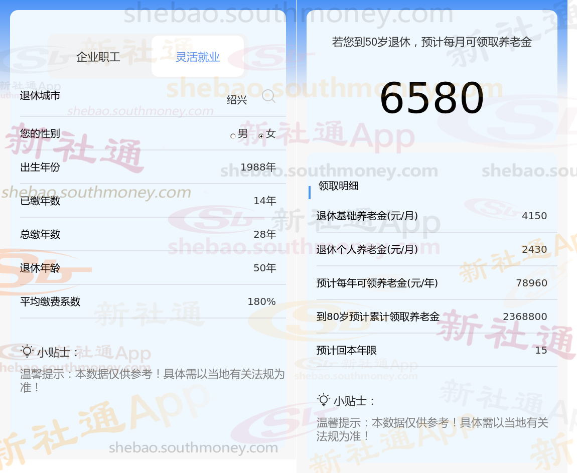 通过新社通APP-养老金计算所得:退休城市、出生年份、退休年龄、缴费系数都相同的情况下,社保缴费年限累计28年时,计算如下: