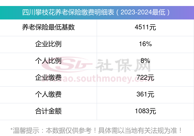 据新社通app显示,四川攀枝花职工养老保险最低缴费基数为:4511元;单位和个人的缴费比例分别为:16%、8%;