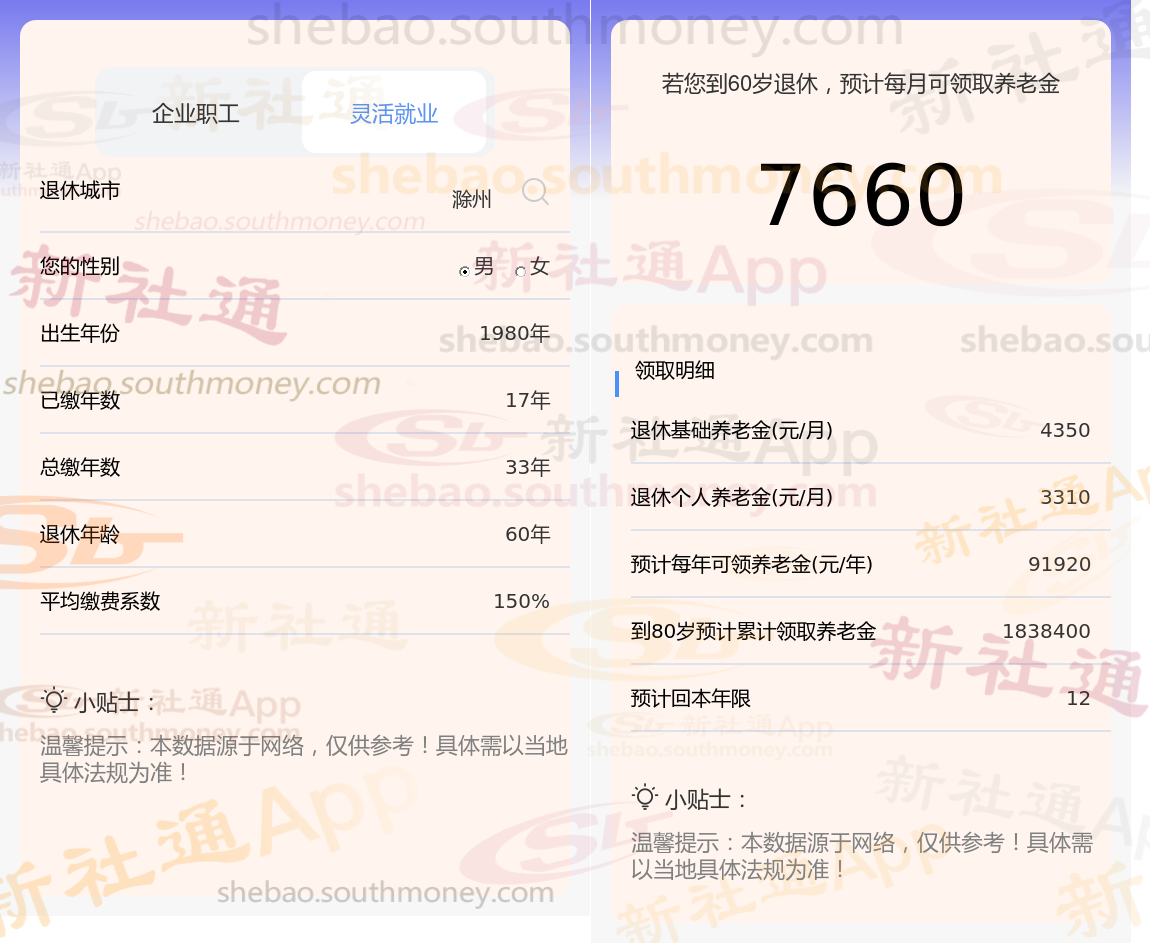 通过新社通APP-养老金计算所得:退休城市、出生年份、退休年龄、缴费系数都相同的情况下,社保缴费年限累计33年时,计算如下: