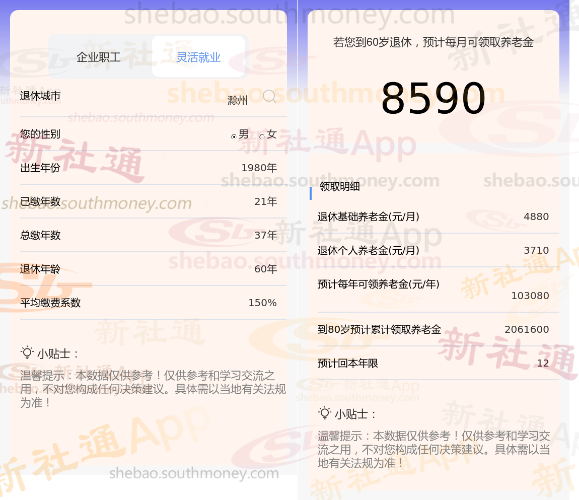 通过新社通APP-养老金计算所得:退休城市、出生年份、退休年龄、缴费系数都相同的情况下,社保缴费年限累计37年时,计算如下: