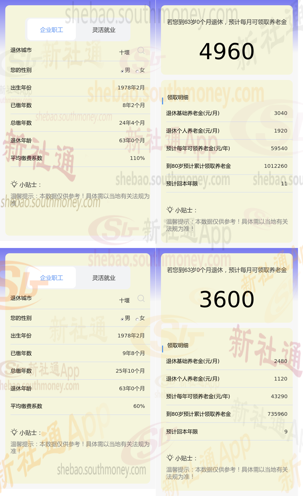 根据新社通app养老金计算器,轻松测算您的养老金!计算结果显示,单位员工与夏某的养老金差距源于缴费年限和缴费档位的差异,这一差距具体体现在数额上,单位员工的4960元减去夏某的3600元,等于1360元。