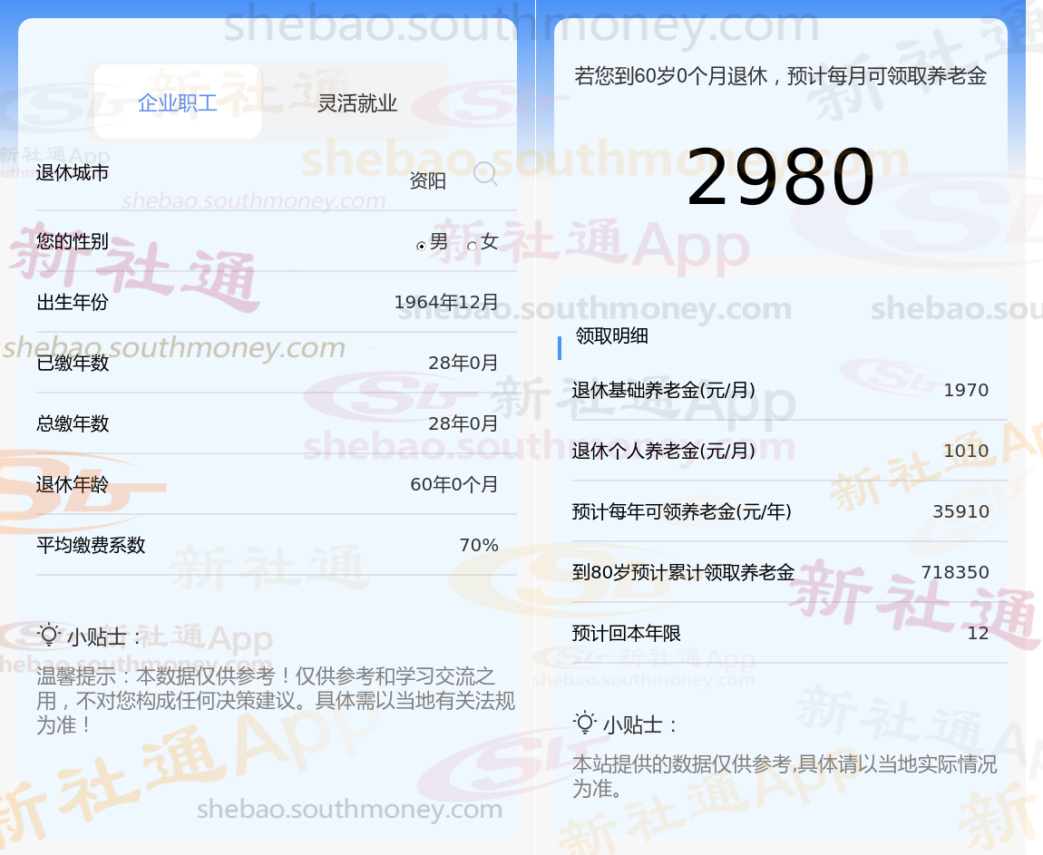 刘某,作为一位勤勉的职工,他的养老保险缴纳记录长达28年之久,且缴费档次一直保持在较高的70%水平。基于这些关键数据,我们利用新社通app养老金计算器,结合最新的养老保险法规,对其养老金进行了如下估算: