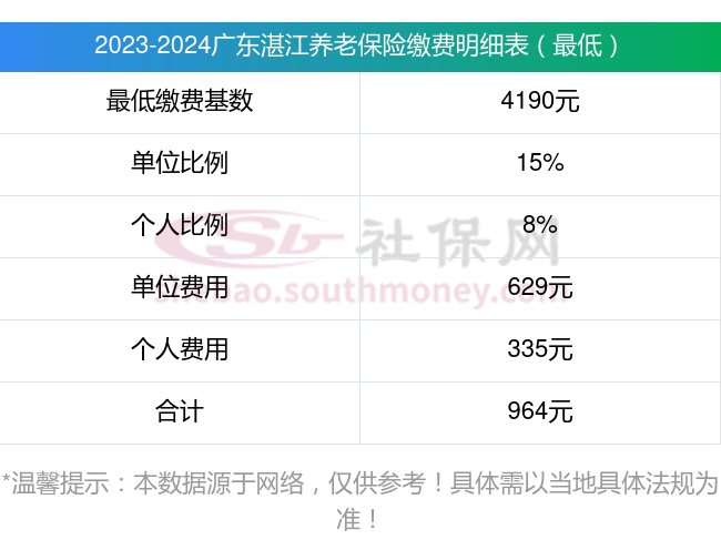 广东湛江养老保险缴费基数2023-2024年最新标准(最低)