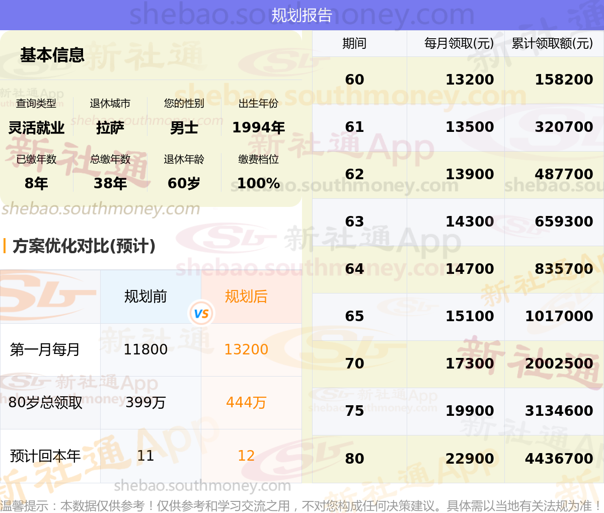 如何选择缴费基数和年限,这直接影响退休后的养老金。社保遵循原则是:想要多拿养老金,我们就必须每个月多缴社保,而且年限越长越好。这就是所谓的“多缴多得,长缴多得”。但问题是,究竟“多缴”还是“长缴”更有效呢?根据我们的养老金测算表显示,应该是“长缴”比“多缴”更有效。新社APP根据养老保险待遇的计算规则素作出相关的规划。举例西藏拉萨