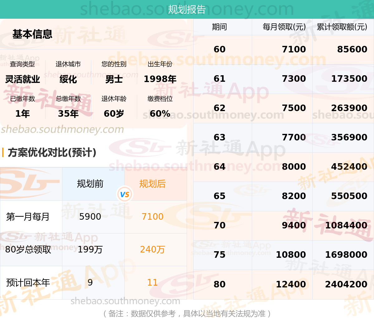 规划前:60岁第一个月约领5900元,新社通APP-养老金规划后:60岁第一个月约领7100元