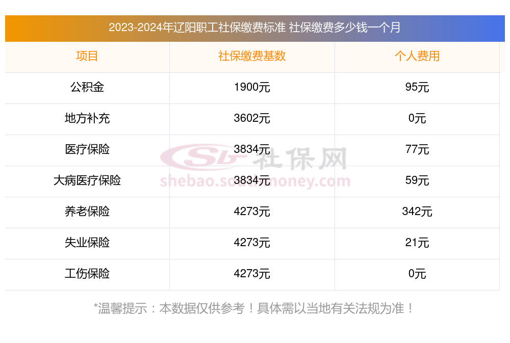 2024年辽阳社保缴费多少钱?下表是2023-2024年辽阳社保费用明细参考,根据新社通app-社保缴费查询工具提供的最新数据如下: