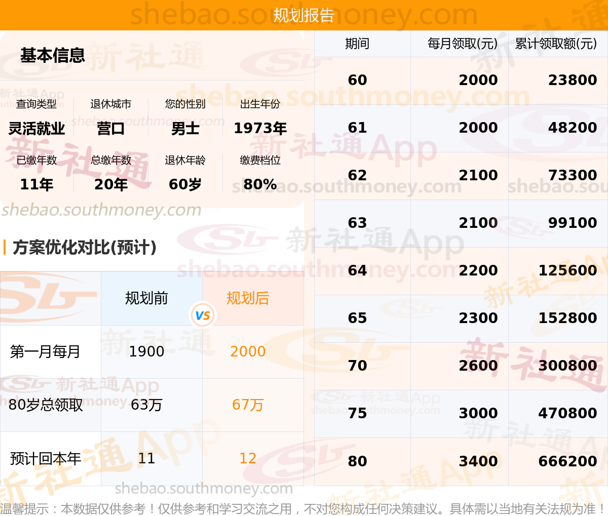 规划前:参保城市:辽宁营口,性别:男士,出生年月:1973,已缴年限:11年,总缴年数:20年,退休年龄:60岁,缴费档位:80%。