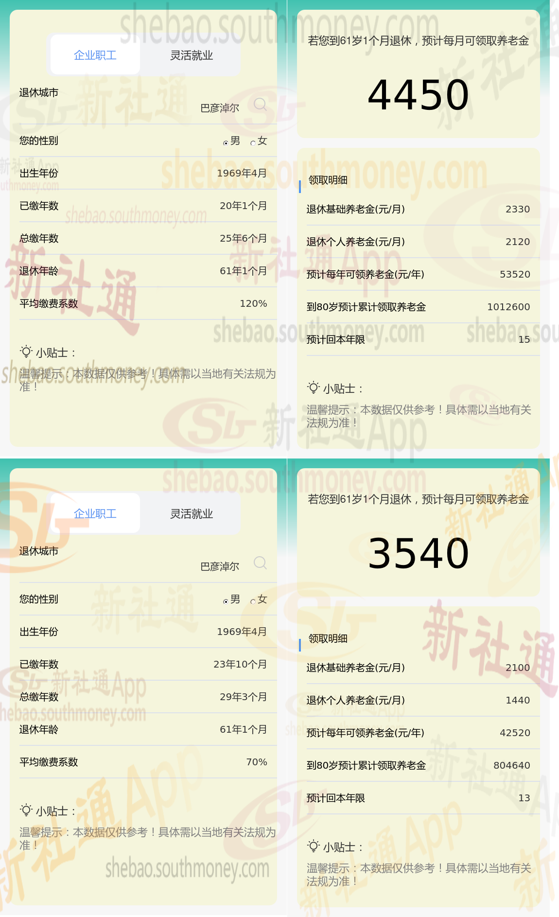 老冯:退休城市巴彦淖尔,缴费年限29年,退休年龄61周岁,但是按70%缴纳社保。