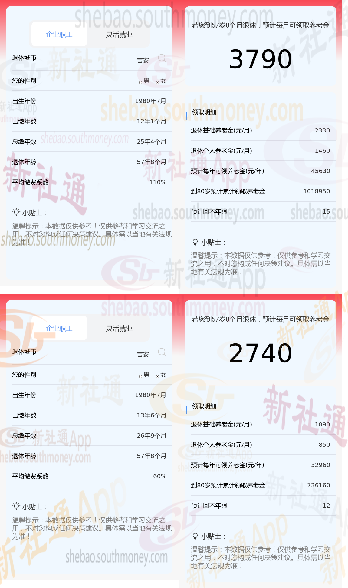 老赵:退休城市吉安,缴费年限26年,退休年龄57周岁,但是按60%缴纳社保。