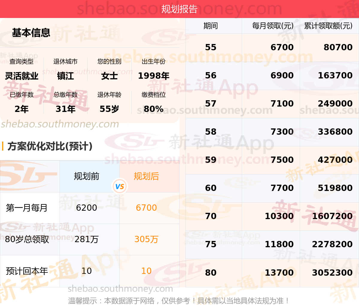 规划前:参保城市:江苏镇江,性别:女士,出生年月:1998,已缴年限:2年,总缴年数:31年,退休年龄:55岁,缴费档位:80%。