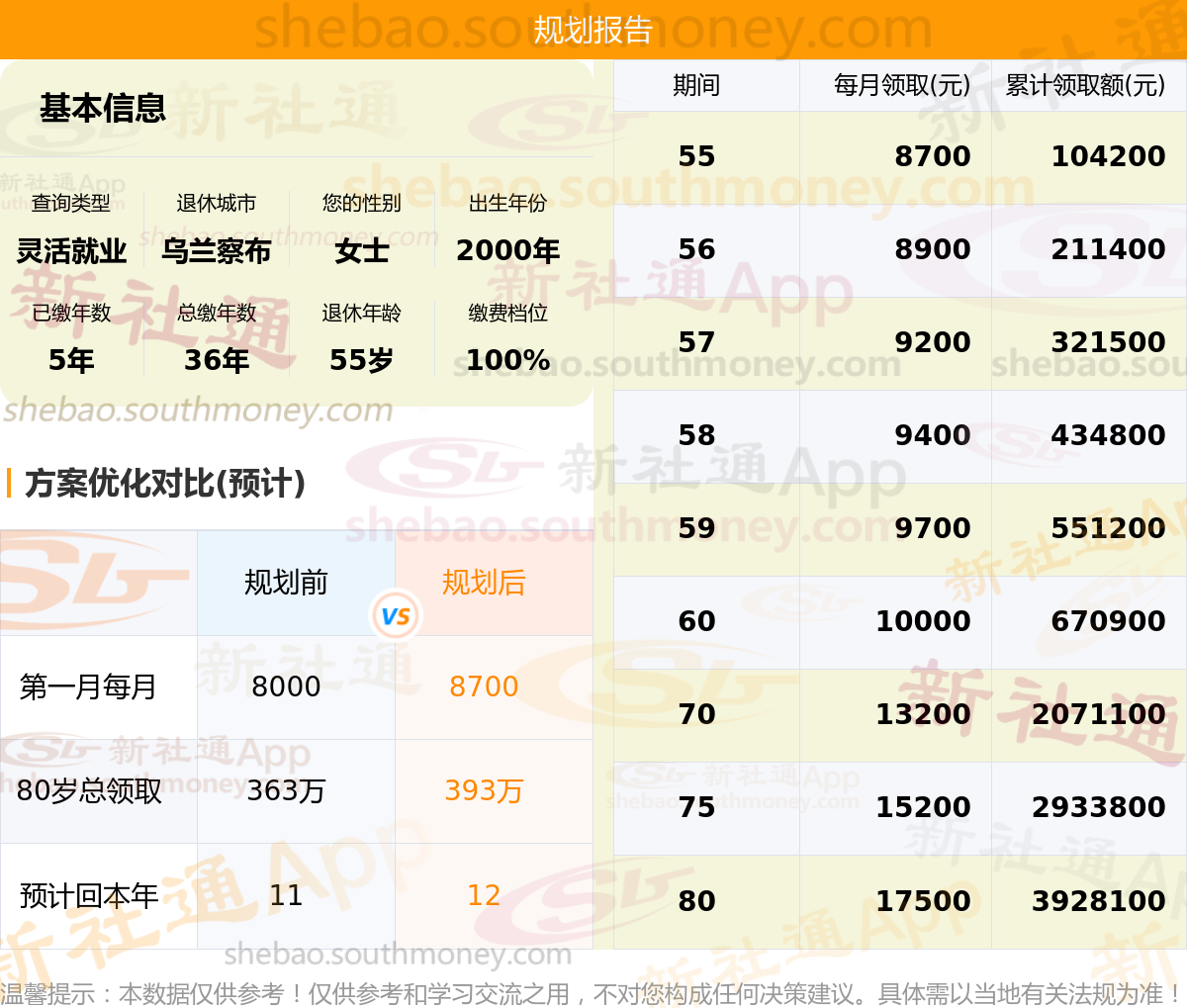 规划前:参保城市:内蒙古乌兰察布,性别:女士,出生年月:2000,已缴年限:5年,总缴年数:36年,退休年龄:55岁,缴费档位:100%。