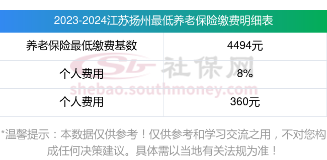 江苏扬州养老保险缴费基数2023-2024年最新标准(最低)一个月要交多少钱?举例说明