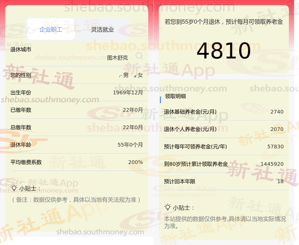 邻居沈某退休城市在图木舒克,性别:女,出生年份:1969,总缴年数22年,缴费档次:200%,新社通app养老金计算器所得: