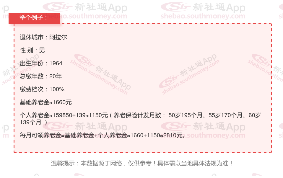 退休城市:阿拉尔,性别:男,出生年份:1964,总缴年数20年,缴费档次:100%,新社通app养老金计算器所得: