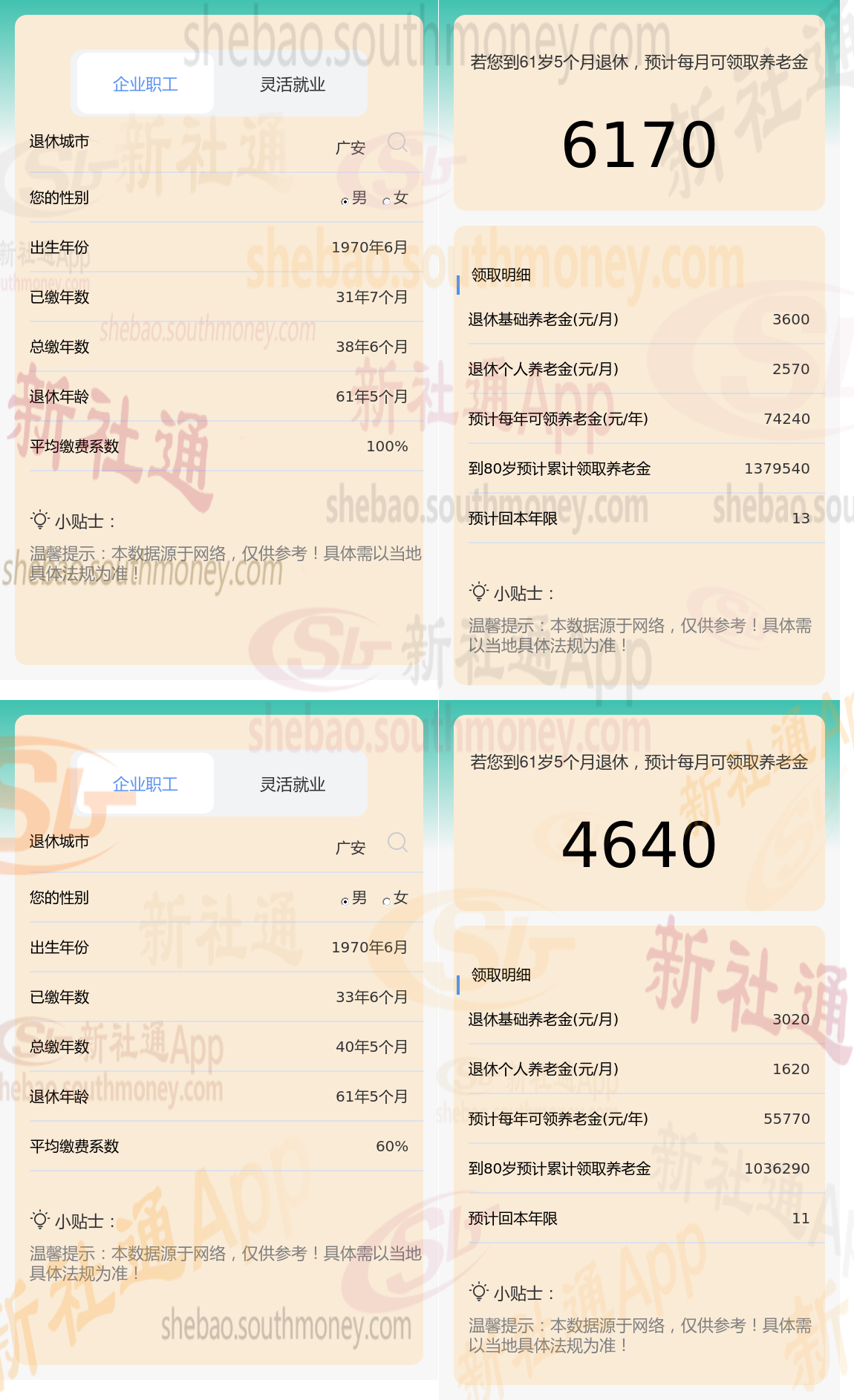 老郑:退休城市广安,缴费年限40年,退休年龄61周岁,但是按60%缴纳社保。