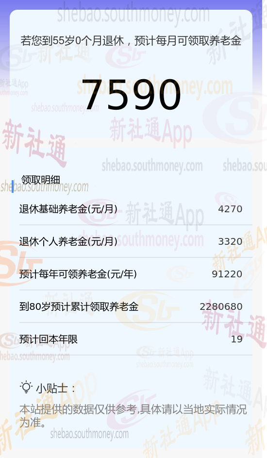 每月可领养老金=基础养老金+个人养老金≈4270+3320≈7590元