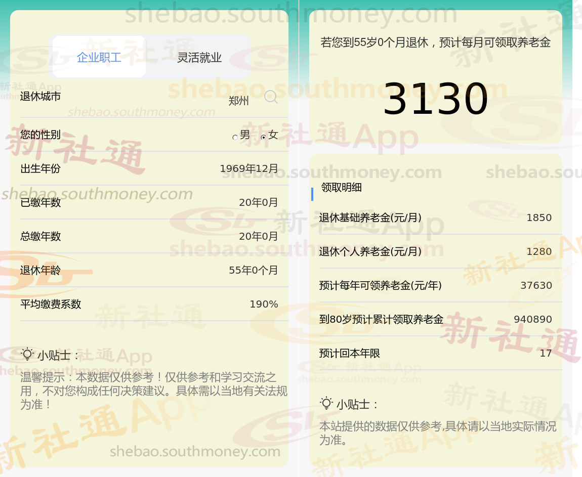 网友康某退休城市在郑州,性别:女,出生年份:1969,总缴年数20年,缴费档次:190%