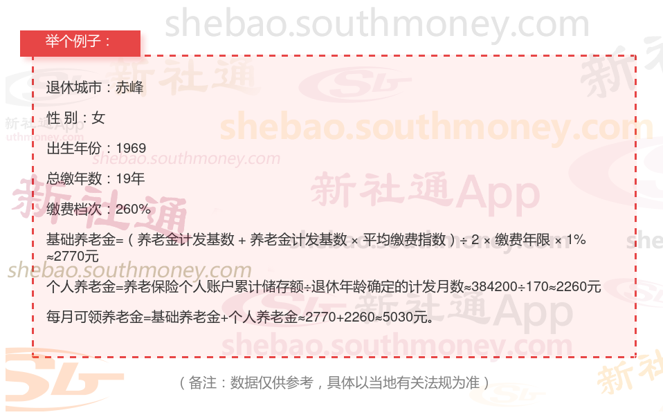 退休城市:赤峰,性别:女,出生年份:1969,总缴年数19年,缴费档次:260%,新社通app养老金计算器所得: