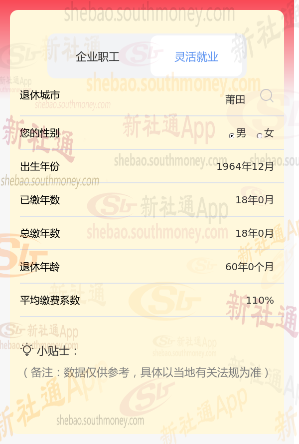 社保按110%档次缴费的谢某,莆田城市退休,出生于1964年,工龄18年,男性。岁月流转,他终于迎来了自己的退休年龄。