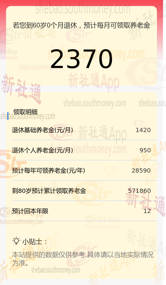 每月可领养老金总额:将基础养老金与个人养老金相加,每月可领取的养老金总额约为2370元(1420元+950元)。