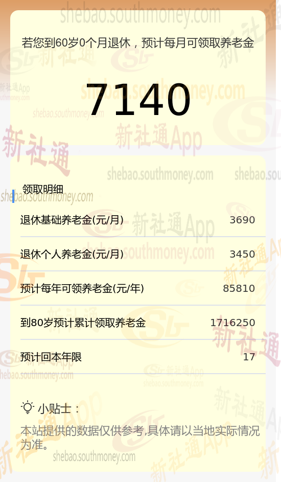 通过公式计算出每月大约3450元。每月可领养老工资合计:3690+3450≈7140元。
