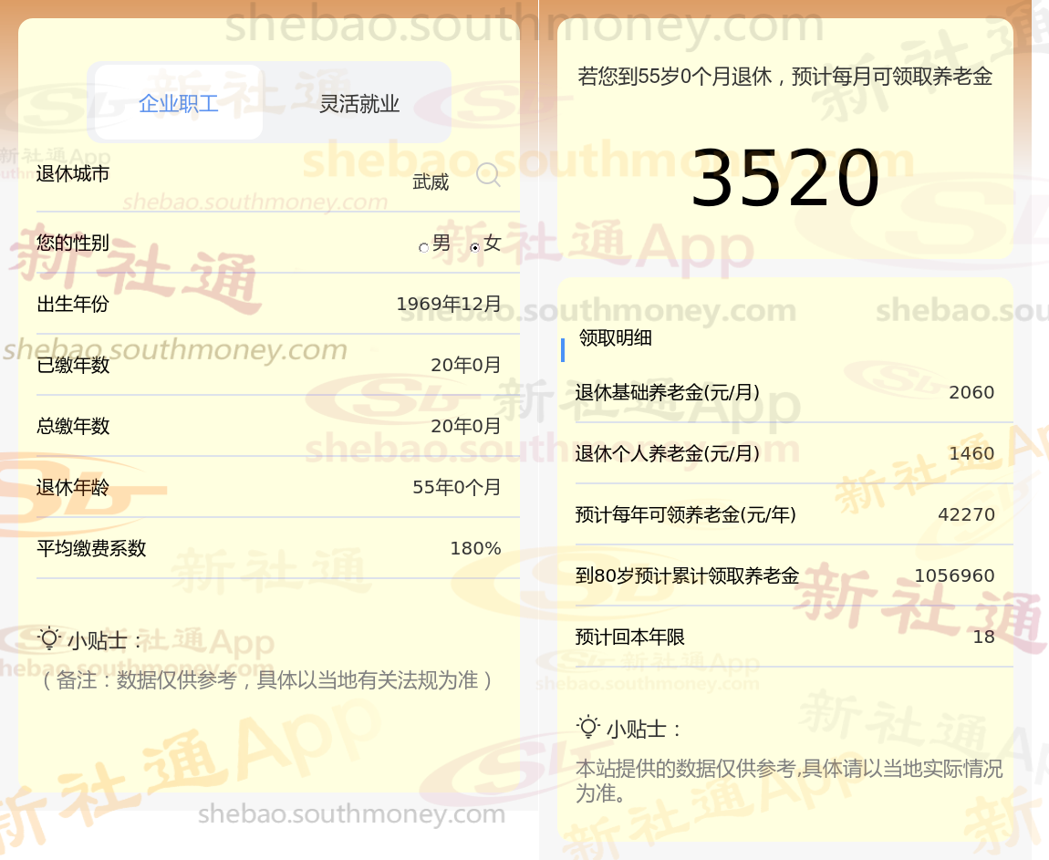 退休城市:武威,性别:女,出生年份:1969,总缴年数20年,缴费档次:180%,新社通app养老金计算器所得: