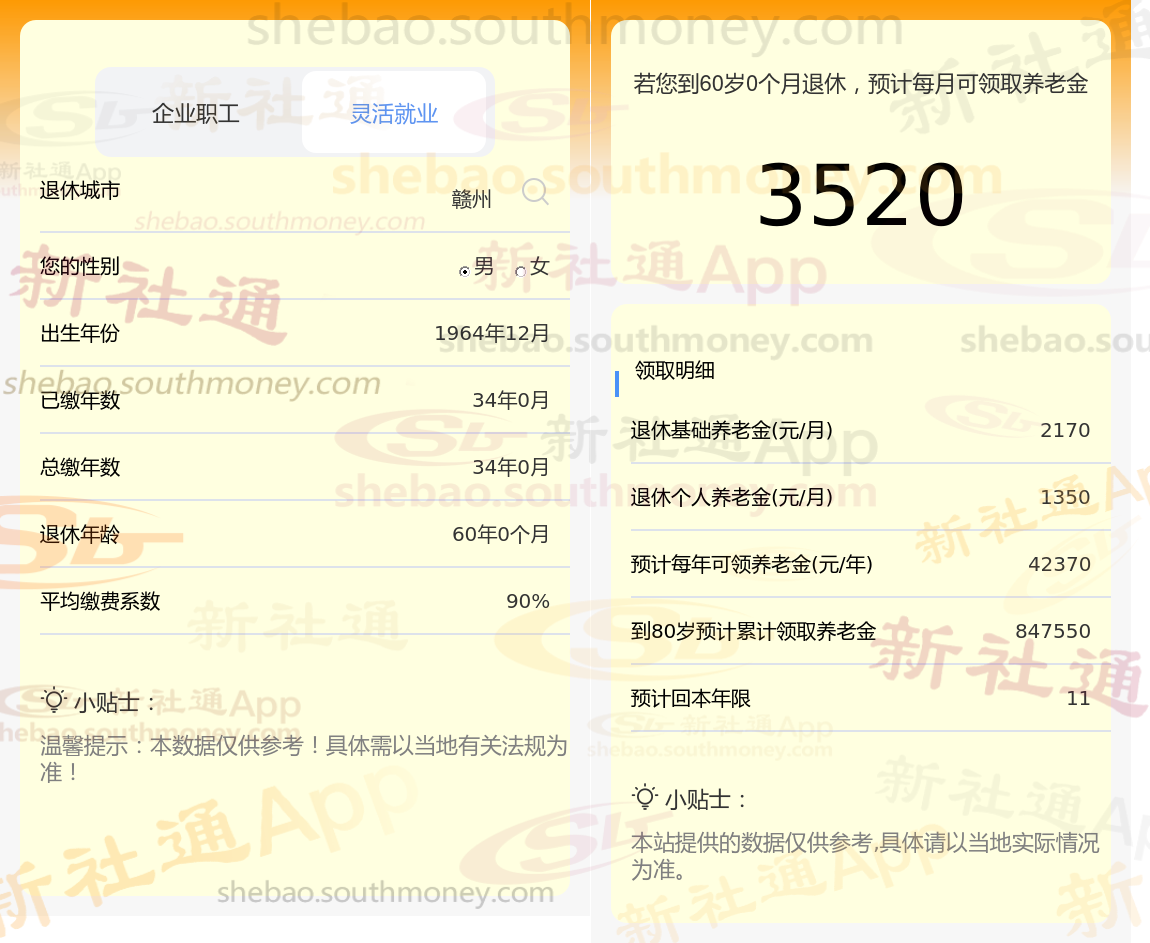 退休城市:赣州,性别:男,出生年份:1964,总缴年数34年,缴费档次:90%,新社通app养老金计算器所得: