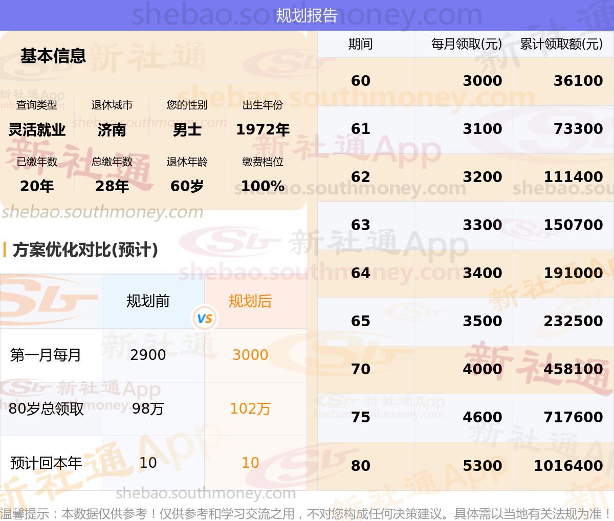 规划前:60岁第一个月约领2900元,新社通APP-养老金规划后:60岁第一个月约领3000元