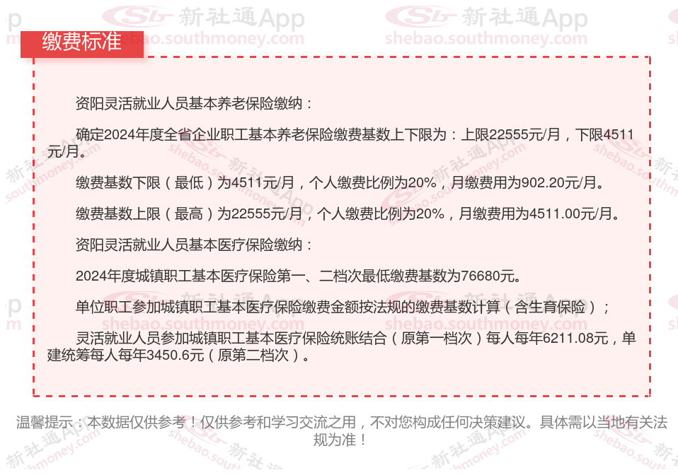 资阳社保缴费多少钱?下表是2023-2024年资阳社保费用明细参考,根据新社通app-社保缴费查询工具提供的最新数据如下: