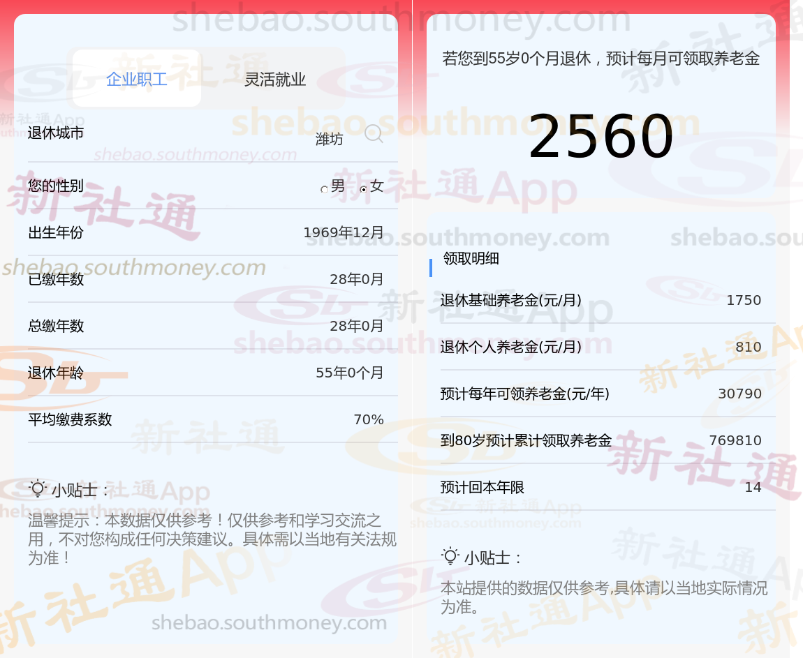 基于这些关键信息,我们使用新社通app养老金计算器对他未来的养老金进行了详细估算: