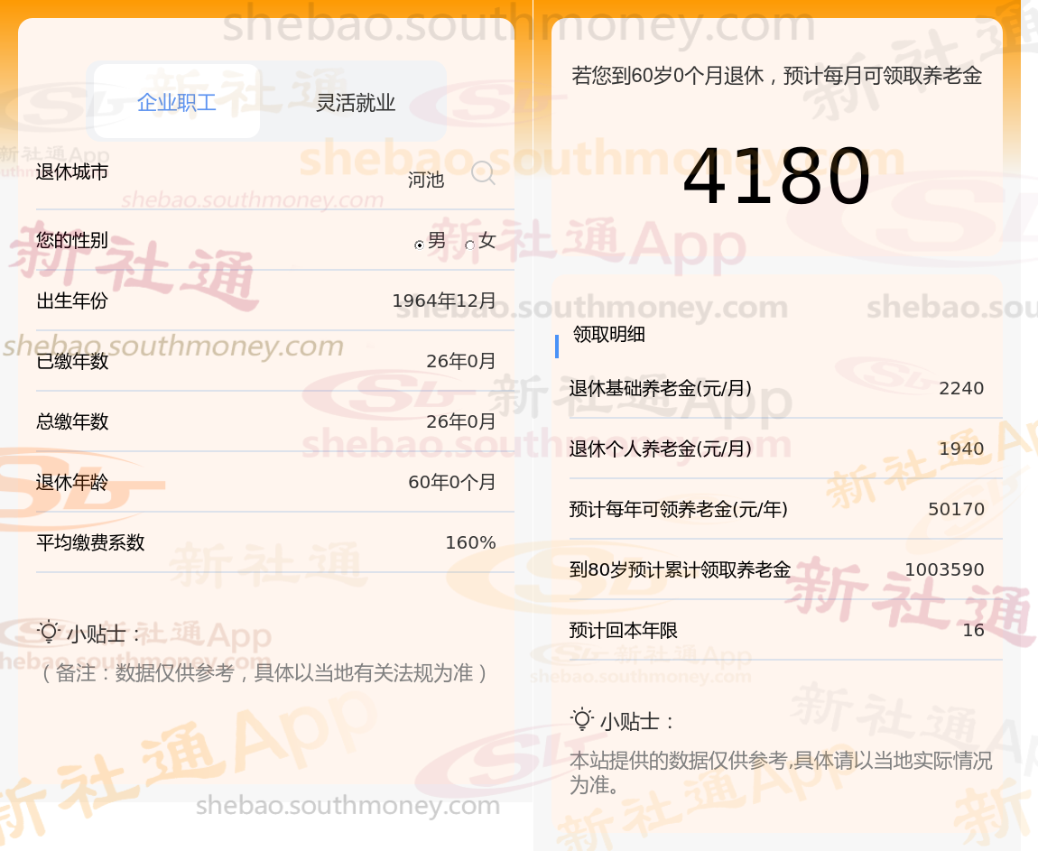 林某,拥有长达26年的养老保险缴纳年限,其缴费档次一直维持在较高的160%水平。基于这些详细信息,我们使用了新社通app养老金计算器,并参考了当前的养老保险法规,对他未来的养老金进行了如下估算: