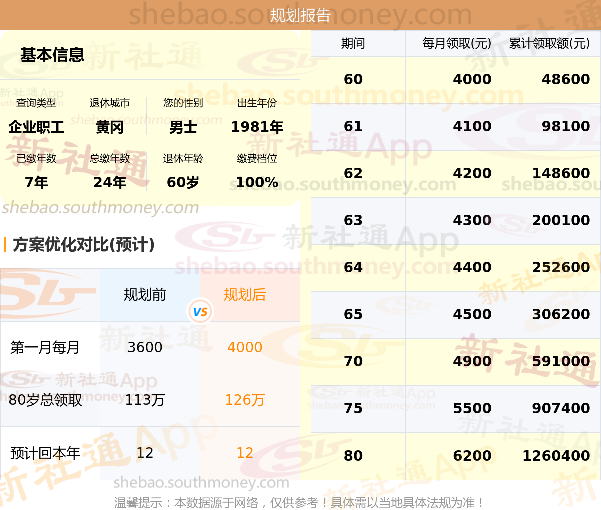 居住城市:湖北黄冈,性别:男士,出生年月:1981,已缴年限:7年,总缴年数:24年,退休年龄:60岁,缴费档位:100%。