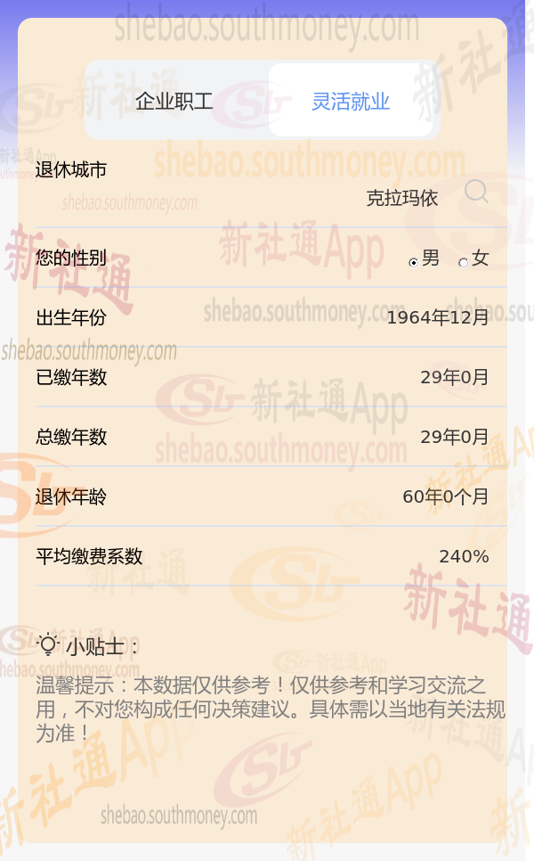 张某是一位男性,1964年出生,现已退休。他居住的城市是克拉玛依,在职业生涯中,他累计缴纳了29年的社会保险,缴费档次为240%。