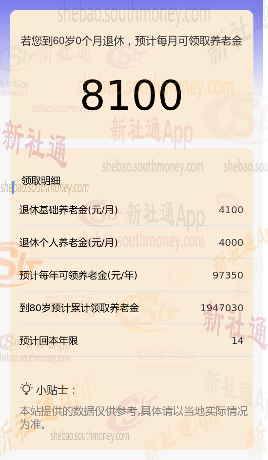 每月可领养老金总额:将基础养老金与个人养老金相加,每月可领取的养老金总额约为8100元(4100元+4000元)。